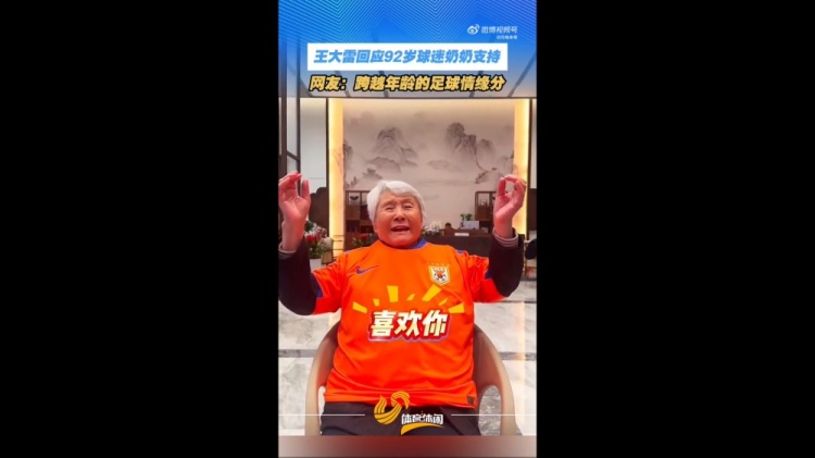 一位92岁球迷奶奶表示她是泰山队的球迷,这位老人家说道:“王大雷助威 ,喜欢你,泰山队必胜。”