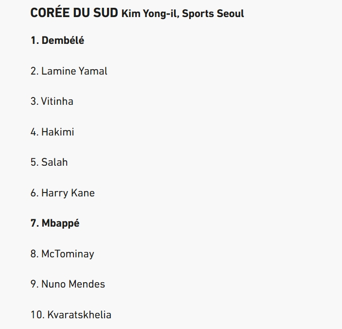 韩国《首尔体育》记者Kim Yong-il金球奖投票: