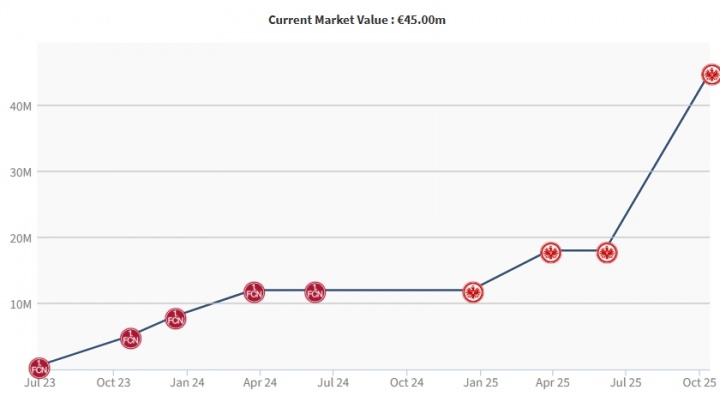 他与法兰克福的合同将在2029年到期,此前据德天空报道,法兰克福为他标价8000万欧,已有多支英超球队有意。