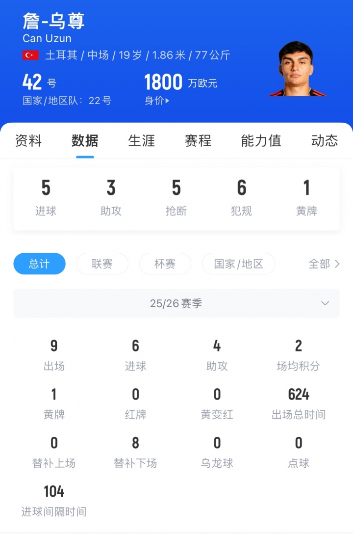 乌尊现年19岁,司职前腰,身高1.86米,法兰克福2024年花费1100万欧将其从纽伦堡签下。本赛季,jrs直播在线他为法兰克福出场9次,贡献6球4助,他此前身价为1800万欧。