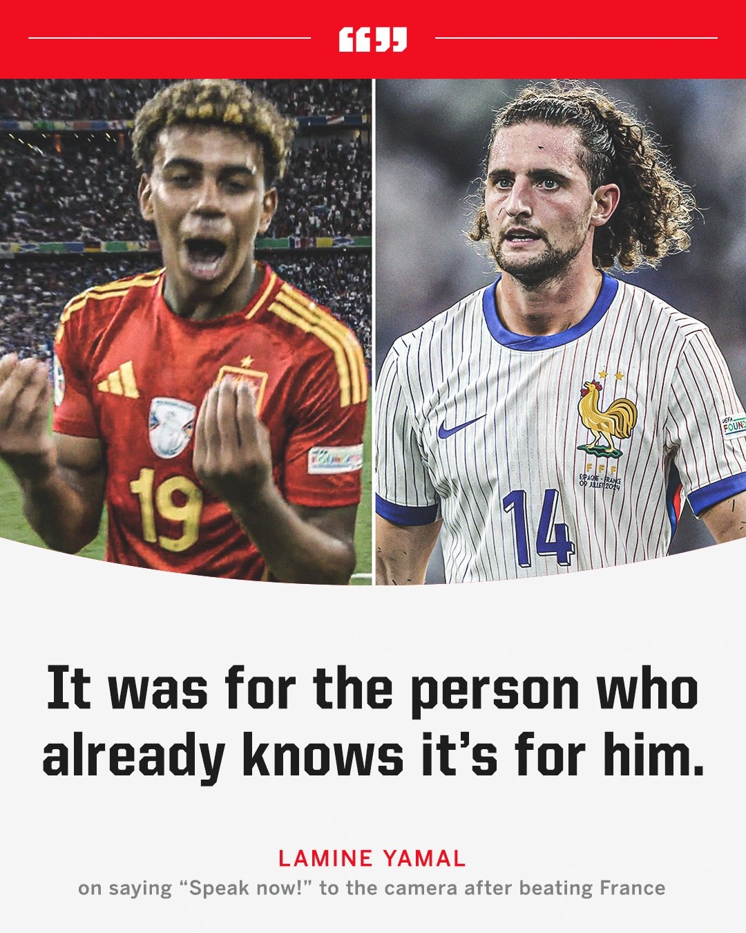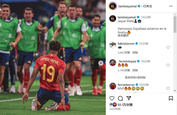 赛后发布会上,亚马尔也回应了法国中场球员拉比奥特赛前对他的评价。当被问到赛事 结束后对着镜头的发言时,亚马尔说道:“我的庆祝动作?这是为那个知道是为他准备的人而准备的。”