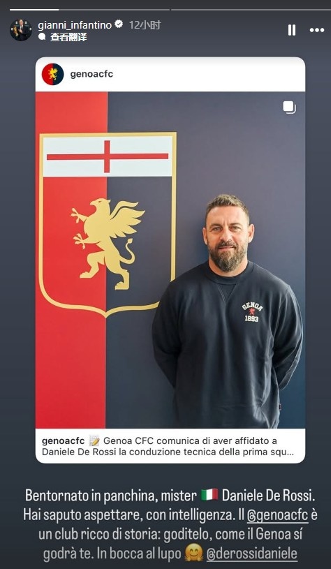 11月7日讯 德罗西昨日正式出任热那亚主帅,国际足联主席因凡蒂诺在自己的ins上向这位前罗马传奇送上了祝贺。