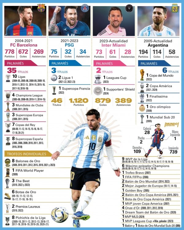 荣誉满满!一图看38岁梅西当前生涯:俱乐部+国家队46冠,8金球!09月05日讯 世界体育报晒照更新梅西生涯荣誉、数据等内容。 梅西生涯目前共出战1120场赛事 ,879球389助,拿下了46个第一名 。 梅西巴萨生涯: 778场672球269助,35冠 梅西巴黎生涯: 75场32球34助,3冠 梅西效力迈阿密国际: 目前73场61球28助,2冠 梅西在阿根廷: 194场114球58助,6冠(