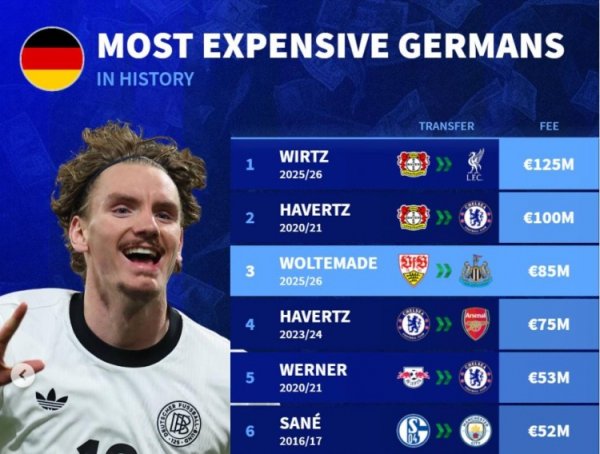 沃尔特马德是德国历史转会费超5千万欧的第5人,维尔茨1.25亿最贵9月1日讯 沃尔特马德已经官宣加盟纽卡斯尔,《转会市场》统计显示他也是第5位转会费超过5000万欧元的德国球员(哈弗茨两次上榜)。 德转列德国籍球员历史转会费榜:欧元 维尔茨,勒沃库森→利物浦,1.25亿 哈弗茨,勒沃库森→切尔西,1亿 沃尔特马德,斯图加特→纽卡斯尔,8500万 哈弗茨,切尔西→阿森纳,7500万 维尔纳,莱比
