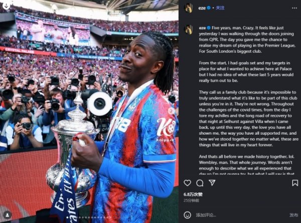 埃泽:五年岁月感恩有你,感谢水晶宫给予我的永恒的爱8月24日讯 转会阿森纳的埃泽更新社媒告别水晶宫。 埃泽:五年光阴,恍如昨日。从我踏入水晶宫大门的那一刻起,你们给了我实现英超理想 的机会,让我为南伦敦最大的俱乐部效力。从一开始,我就设定了目标,想要在这里有所成就,但从未想到这五年会如此出色 。 人们称我们为“家庭俱乐部”,因为除非你身在其中,否则很难真正理解成为这个大家庭一员