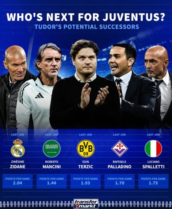会是谁?德转列尤文新帅5大热门:齐达内、曼奇尼、斯帕莱蒂在列10月27日讯 尤文俱乐部今日已经通过官方宣布,解雇47岁主帅图多尔。《转会市场》也预测了几位尤文新帅热门候选,并列出了他们的上一次执教球队和场均拿分。 德转列尤文新帅5大候选: 齐达内:皇马,2.04分 曼奇尼:沙特,1.44分 泰尔齐奇:多特,1.93分 帕拉迪诺:佛罗伦萨,1.70分 斯帕莱蒂:意大利,1.75分