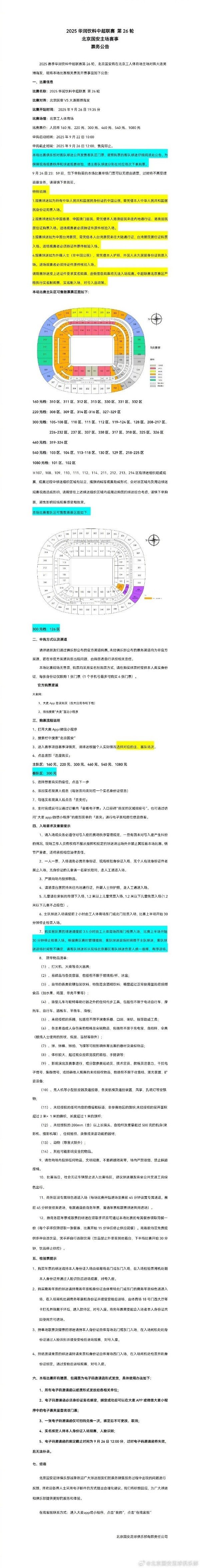 北京国安vs大连英博主场作战 赛事票务公告,9月22日10点申购启动2025华润饮料中超职业联赛 第26轮,北京国安将在北京工人运动场 主场作战 对阵大连英博,现将本场赛事 相关票务开票事宜如下公告,请各位球迷详细阅读图中的公告内容。 ⏰⏰⏰ 9月22日10点,申购启动。 请各位球迷关注公告内容,及时购票~