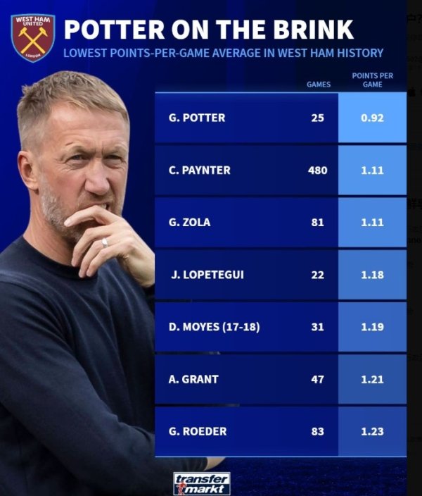 难逃下课命运?波特场均仅拿0.92分,为西汉姆联队史最低