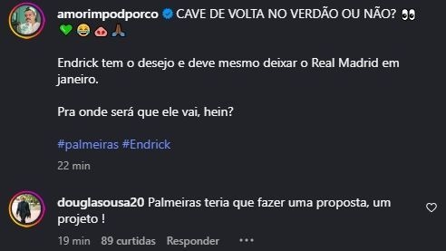 10月23日讯 来自Podporco的记者加布里埃尔・阿莫林在 Instagram 上发布了一条帖子,谈及恩德里克可能离开皇家马德里的话题,并向其粉丝提问,询问这位前场球员是否有可能回归 帕尔梅拉斯。恩德里克的父亲道格拉斯·索萨在这条社媒下评论道:“帕尔梅拉斯必须得提出一份报价,(同时)拿出一个方案。”