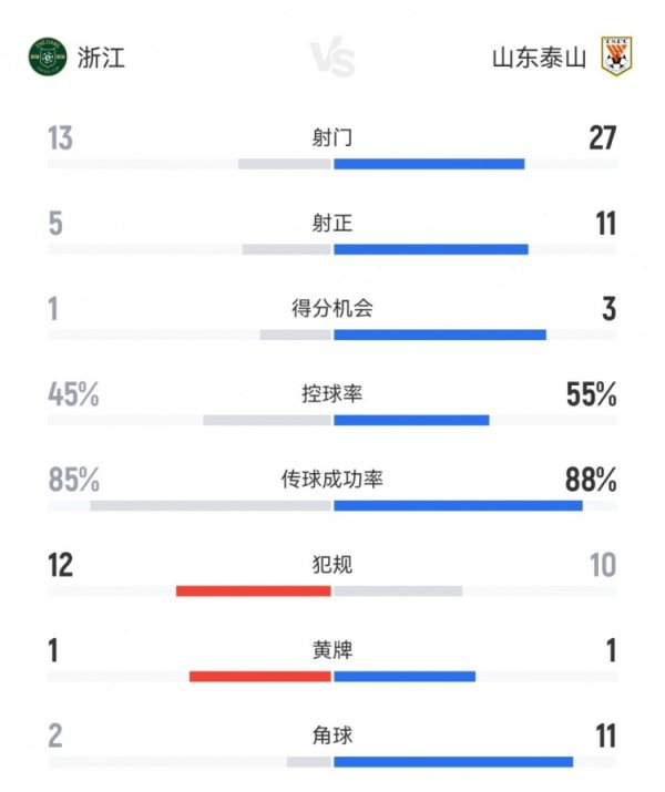 浙江2-2泰山数据:射球 13-27,射正5-11,积分 机会1-3,底线球2-1110月18日讯 本轮中超,浙江队主场作战 2-2山东泰山。双方全场重积分 据对比如下↓(主队浙江在前) 射球 13-27 射正5-11 积分 机会1-3 盘带时间 45%-55% 传送球 成功率85%-88% 违例 12-10 警告 1-1 底线球2-11