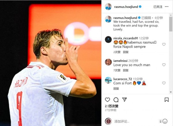 2射1传!霍伊伦庆祝获胜 :远征客场应战 轰入6球+领跑小组,太美妙了10月10日讯 世预赛欧洲区赛事 ,霍伊伦2射1传,帮助丹麦客场应战 6-0大胜白俄罗斯。 霍伊伦社媒晒出赛事 照片,庆祝球队取胜,配文:“我们远征客场应战 ,享受赛事 ,轰入6球,拿下获胜 并领跑小组!太美妙了。”