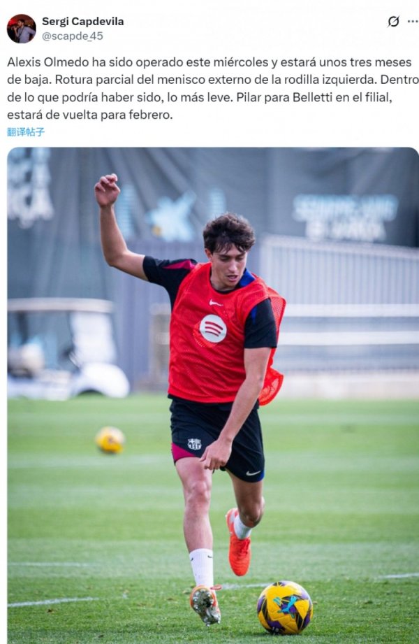 记者:巴萨19岁中卫奥尔梅多今日接受手术,预计伤缺三个月11月5日讯 据记者Sergi Capdevila报道,巴萨19岁中卫奥尔梅多预计将伤缺三个月。 Sergi Capdevila透露,巴萨竞赛 (巴萨B队)小将奥尔梅多左膝外侧半月板部分撕裂,在预期的伤情中,这是最轻微的。奥尔梅多今日了接受手术,预计将伤缺三个月,明年2月回归。 奥尔梅多本赛季为巴萨竞赛 和U19梯队出战9场赛事