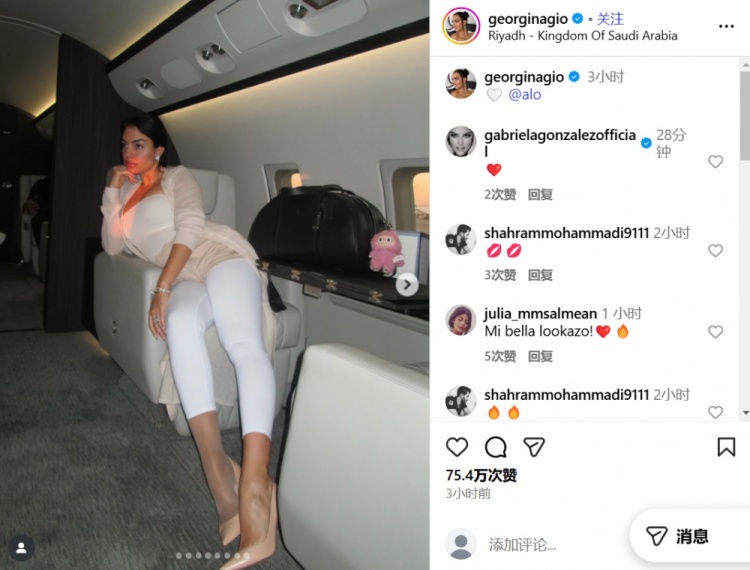 在社交媒体上,乔治娜晒出了自己前往利雅得的相关照片,沙特联直播看起来将会陪伴C罗。目前,C罗在利雅得获胜 效力,这名40岁老将依然有着良好的竞技状态 。