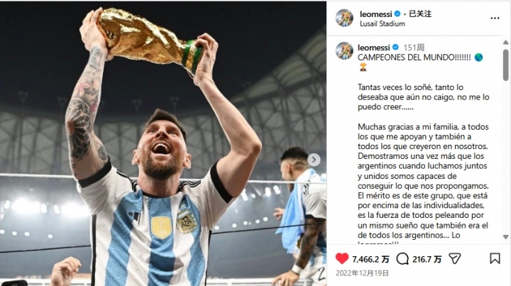 1-梅西社媒发文庆祝世界杯赛 夺魁 ,7466.2万