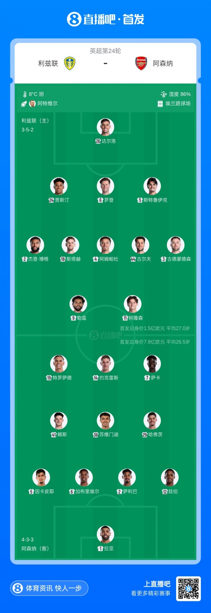 01月31日讯 北京时间今晚23点,英超第24轮,阿森纳客场应战 对阵利兹联,赛前双方公布杆位阵形 。阿森纳方面,约克雷斯迎来先发,哈弗茨与赖斯、苏维门迪搭档中场球员,雨燕直播足球免费直播官网厄德高后备 待命。