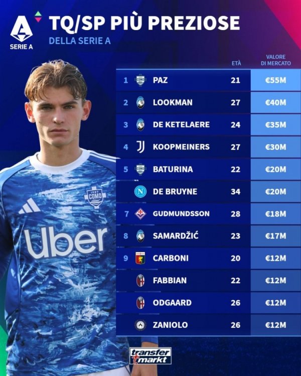 意甲前腰、二前场球员身价排行:尼科-帕斯居首,德布劳内并列第五10月16日讯 日前,德国转会市场统计了意甲前腰、二前场球员身价排行,尼科-帕斯5500万欧居首,德布劳内2000万欧并列第五。 1、尼科-帕斯(科莫):21岁,5500万欧 2、卢克曼(亚特兰大):27岁,4000万欧 3、德凯特拉雷(亚特兰大):24岁,3500万欧 4、库普梅纳斯(尤文):27岁,3000万欧 5、巴图里纳