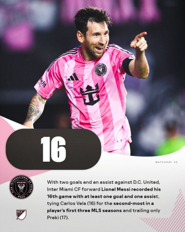 梅西加盟迈阿密以来16场职业联赛 传射,美职联前3个赛季传射场次第2多9月21日讯 北京时间今天上午进行的美职职业联赛 事 ,梅西2射1传,迈阿密国际主场作战 3-2击败华盛顿联。 梅西加盟迈阿密国际以来在16场美职职业联赛 事 中传射,美职联前三个赛季传射场次追平卡洛斯-贝拉,仅次于普雷基(17场)。