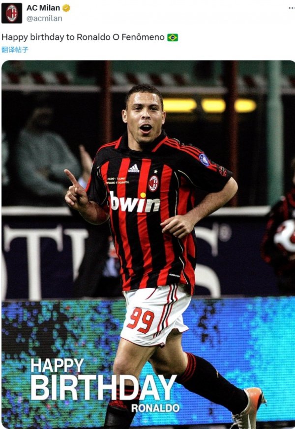 罗纳尔多迎49岁生日,AC米兰官推晒照为其送上生日祝福9月22日讯 今天是巴西名宿罗纳尔多49岁生日,前东家AC米兰也晒出海报为其送上生日祝福。 罗纳尔多曾在06/07赛季以及07/08赛季效力AC米兰,为球队共计20次出场打进9球并有5次助功 。
