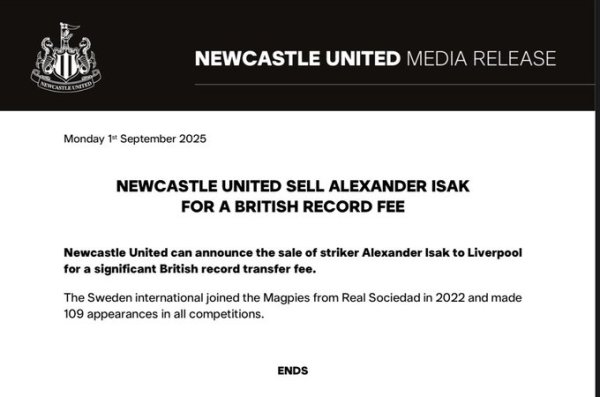 没有祝福!纽卡官方:伊萨克以创英国转会费记录 的价格加盟利物浦9月2日讯 利物浦已经官宣签下伊萨克,纽卡官方也确认了这一消息,但并未按照通常的情况送上祝福。 纽卡官网的声明极为简略:“纽卡斯尔联宣布将前场球员亚历山大-伊萨克以创英国转会费记录 的价格出售给利物浦。这位瑞典国脚于2022年从皇家社会转会至喜鹊,并在各项赛事中出场109次。” 伊萨克现年25岁,瑞典籍前场球员,生涯曾先后效力A