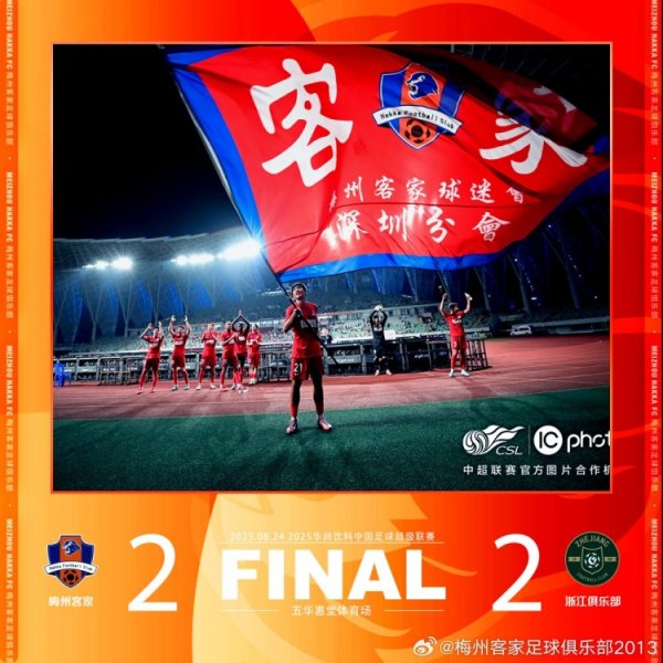 【战报·第22轮】梅州客家2-2浙江俱乐部北京时间8月24日19:00,2025华润饮料中国古代足球 超级职业联赛 第22轮,梅州客家坐镇五华奥体中心对阵浙江俱乐部。 开场后,梅州客家立足防卫 反击,奥马尔松错失绝佳机会,郭全博多次做出关键抢救 。转折点出现在第38分钟:梅州客家获得十二码球机会,由刘云冷静命中,梅州客家1-0领跑 结束上半场前半段。然而,上半场补时阶段