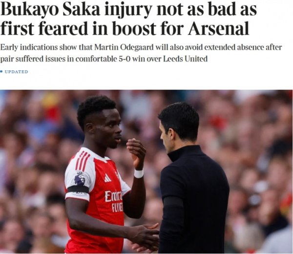 枪手利好!泰晤士:萨卡&厄德高伤情不严重,是否缺战利物浦未定08月24日讯 据《泰晤士报》消息,初步的伤情检查表明,萨卡和厄德高的伤势并不严重。 在昨日英超阿森纳5-0击败利兹联的赛事 中,萨卡和厄德高双双因伤离场,引发众多枪迷担忧。主帅阿尔特塔在赛后曾表示,萨卡的伤情可能“不乐观”。 但最新的初步检查结果显示,萨卡和厄德高的伤势并不像最初担心的那么严重,这对阿森纳来说是一个大好消息。至