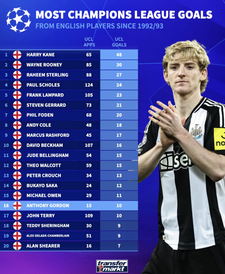 凯恩65场欧冠打进48球居首;鲁尼和斯特林分别打进30和27球排名二三;戈登已经打进10球暂排第16位。