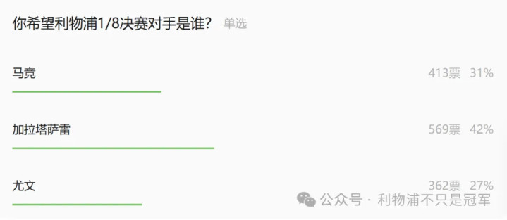 这样在北京时间明天(本周五)19点的抽签仪式上,利物浦下一轮的对手将在加拉塔萨雷和马竞之间产生。卡拉格在今天赛事 结束后表示,他更希望利物浦抽到加拉塔萨雷,并自信的表示利物浦99%能出局 加拉塔萨雷,但如果抽到马竞,他认为利物浦的晋级下一轮 机会是60%。卡拉格更想要加拉塔萨雷的观点,与我们昨天的投票情况一致,更多人选择了加拉塔萨雷,甚至有27%选择了昨天赛前三球追赶 的尤文,大家多少还是对马竞抱有更多“敬畏”之心。