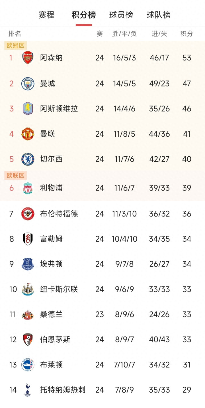 中游球队的格局也因本轮结果而改变。制造最大冷门的布伦特福德,在客场应战 少打一人的情况下顽强战胜维拉,全取三分后积分达到36分,排名升至第七。这支球队已经悄然挤进了欧战资格争夺者的行列,成为了下半程不可忽视的爆冷体育选手 。而热刺凭借战平曼城拿到的1分,积分达到29分,暂时位列第14,处境有些尴尬,既远离欧战区,又暂无降级之忧。