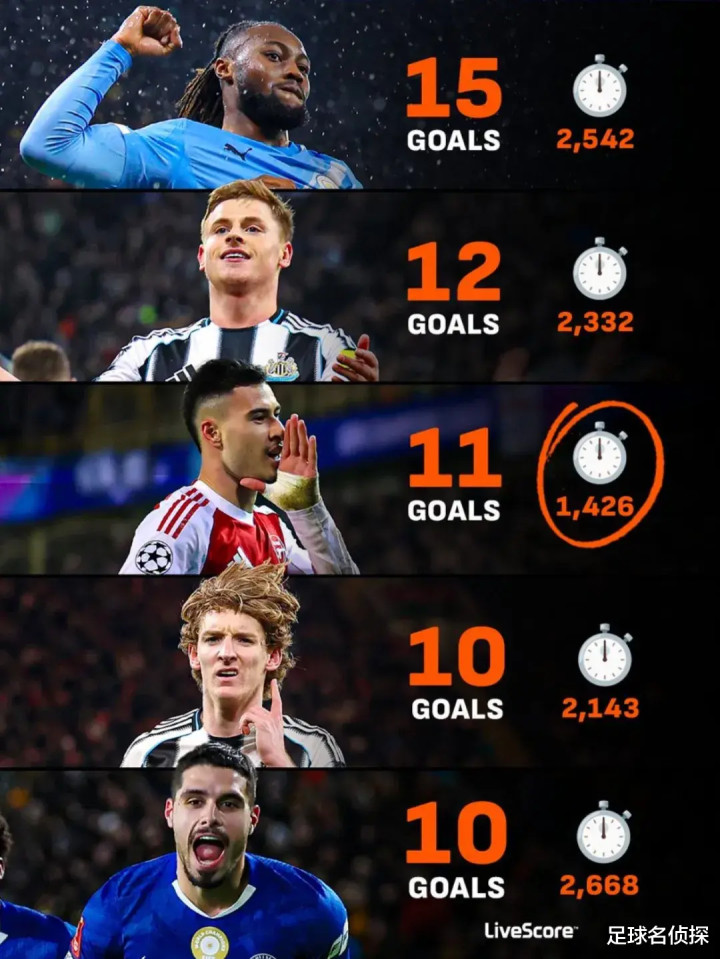 (对狼队之前)数据统计 ,本赛季各项赛事打进10球以上的英超翼锋中,马丁内利是用时最少、效率最高的。