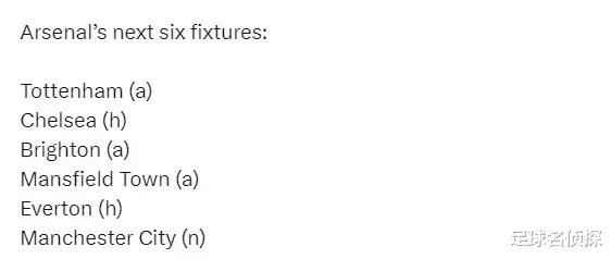 阿森纳未来6场赛事 :客战热刺、主战切尔西、客战布莱顿、客战曼斯菲尔德、主战埃弗顿、卡拉宝杯总决赛 对曼城。