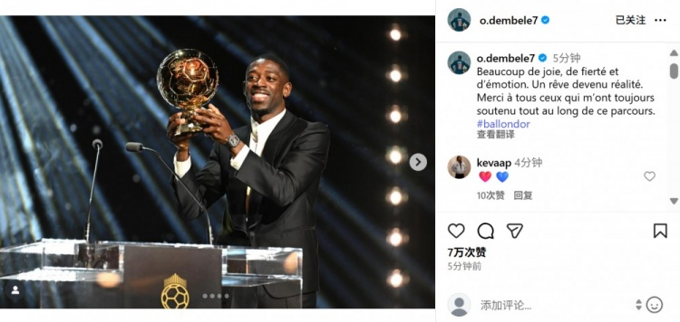 登贝莱在个人社媒也晒出手捧奖杯的照片,配文写道:“这一刻情绪万千,雨燕体育在线直播免费直播无比开心与骄傲。我的一个理想 实现了,感谢一路走来一直支持我的所有人!”