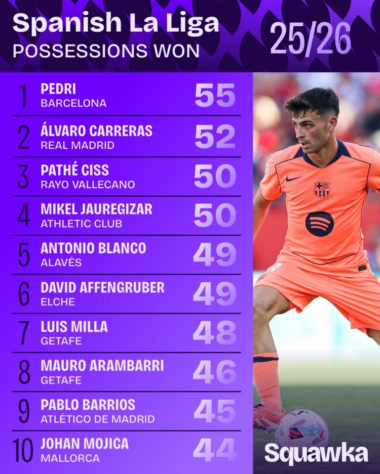 10月7日讯 日前,Squawka统计了本赛季西甲夺回球权次数排行,jrs直播在线佩德里55次居首,卡雷拉斯52次第二。