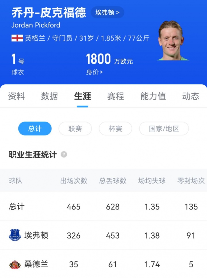 31岁的皮克福德目前已经为埃弗顿出战326场赛事 ,贡献91次零封。目前他的德回转 价为1800万欧元。