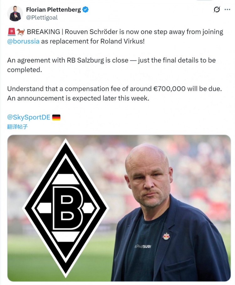 媒体指出,门兴有意聘请萨尔茨堡总监施罗德,让其成为俱乐部的新任总监,以替代离任的维尔库斯,手机看足球直播免费门兴接近与萨尔茨堡达成协议,只剩最后细节有待敲定,补偿金约为70万欧,预计本周晚些时候官宣。