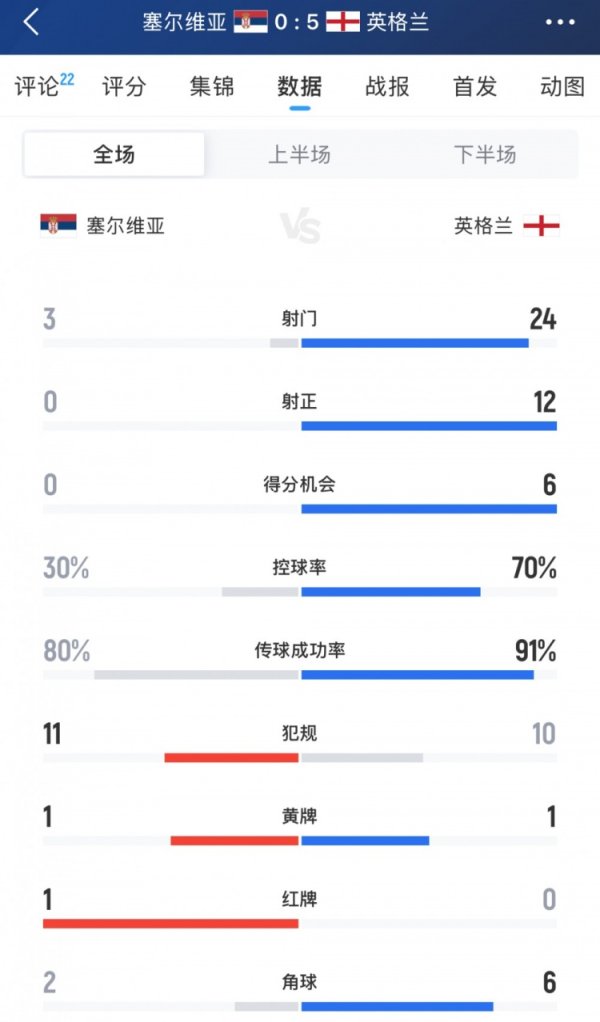 反客为主,英格兰vs塞尔维亚全场数据:射球 24-3,盘带时间 70%-30%9月10日讯 世预赛欧洲区小组赛K组第6轮,英格兰客场应战 5-0大胜塞尔维亚,继续领跑小组。 两队全场数据对比如下(主队塞尔维亚在前,客队英格兰在后): 射球 数:3-24 射正数:0-12 积分 机会:0-6 盘带时间 :30%-70% 传送球 成功率:80%-91% 违例 数:11-10 警告 数:1-1 驱逐 数:1-0