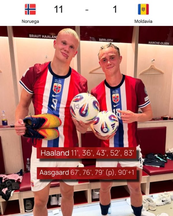 分别打进5球和4球!哈兰德和阿尔茨加尔德均获得赛事 用球9月10日讯 在挪威11-1摩尔多瓦的赛后,哈兰德和阿尔茨加尔德均获得赛事 用球。 在本场赛事 中,哈兰德打进5球送出2次助功 ,阿尔茨加尔德则打进4球。