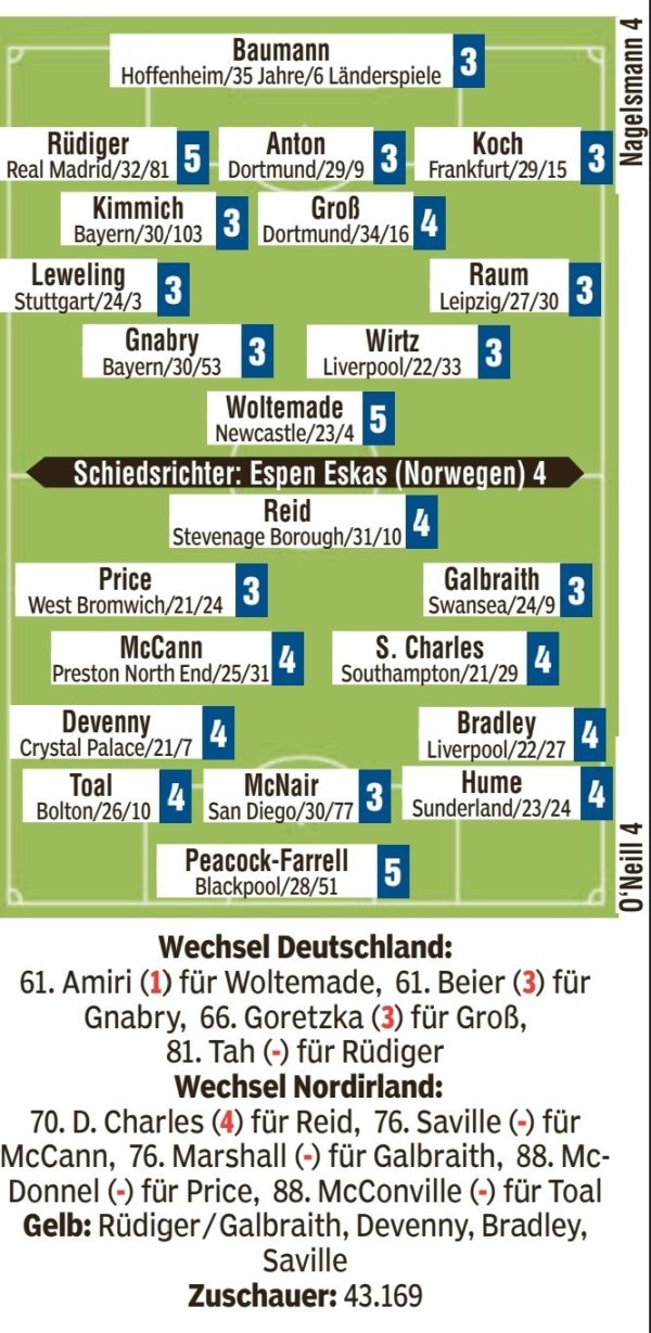 德国队图片报评分:沃尔特马德、吕迪格全队最低,阿米里1分最高9月8日讯 北京时间今天凌晨进行的世预赛,德国主场作战 3-1击败北爱尔兰,《图片报》对两队球员进行了评分。 德国vs北爱尔兰评分 德国 守门员:鲍曼(4) 后场球员:吕迪格(5)、安东(3)、科赫(3) 中场球员:基米希(3)、格罗斯(4)、勒威林(3)、劳姆(3)、格纳布里(3)、维尔茨(3) 前场球员:沃尔特马德(5) 后