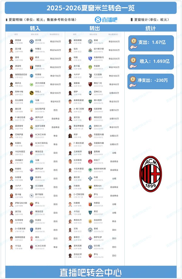 赚了230万!米兰夏窗总结:恩昆库3700万标王,终场前得分签拉比奥特夏窗战火暂熄,硝烟散尽,各队新阵浮出水面。这是一个野心与钞票齐飞的赛季,有人一掷千金落下震撼足坛的重磅炸弹,也有人慧眼识珠觅得被低估的明日之星。现在,是时候为这个疯狂而又出色 的“军备竞赛”做一次全面的盘点了。 为吧友们总结了AC米兰今夏的转会操作,吧友们能打几分? 重要引援: 1:恩昆库 27岁/前场球员 3700万欧 切尔西