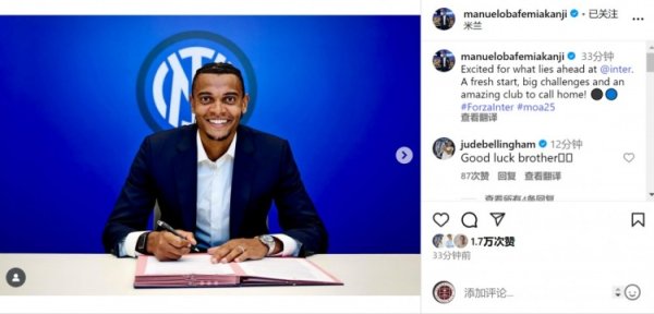 阿坎吉社媒晒与国米签约照片:对即将迎来的新篇章感到兴奋9月2日讯 曼城后场球员阿坎吉租借加盟国米,球员社媒晒出签约的照片。 阿坎吉社媒晒出与国米签约的照片,配文:“对即将在国米迎来的新篇章感到兴奋。全新的开始,巨大的应战 ,以及一个我可以称之为家的伟大俱乐部!”