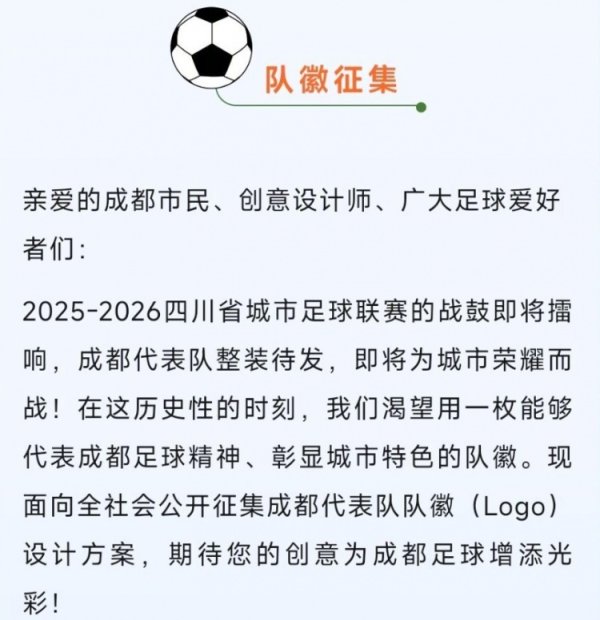 “川超”成都代表队队标 (Logo)征集令发布,最高奖10000元!9月4日讯 “川超”职业联赛 开赛在即,据“锦观新闻”报道,成都代表队队标 (Logo)征集令发布,最高奖10000元! 设计需求体现成都特色、彰显古代足球 精神、设计简洁醒目、色彩和谐 鲜明,且必须为原创作品。投稿时间为9月4日-9月7日。