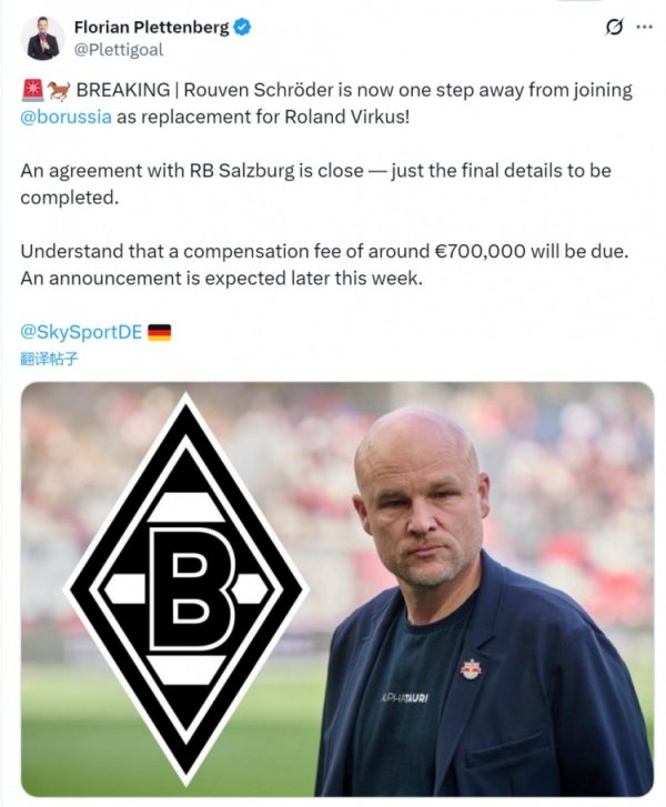 德天空:施罗德接近出任门兴总监,补偿金约70万欧元10月13日讯 据德国天空体育报道,施罗德距离出任门兴总监仅一步之遥。 媒体指出,门兴有意聘请萨尔茨堡总监施罗德,让其成为俱乐部的新任总监,以替代离任的维尔库斯,门兴接近与萨尔茨堡达成协议,只剩最后细节有待敲定,补偿金约为70万欧,预计本周晚些时候官宣。 施罗德曾在不莱梅、美因茨、沙尔克、莱比锡等俱乐部任职,2024年出任萨尔茨