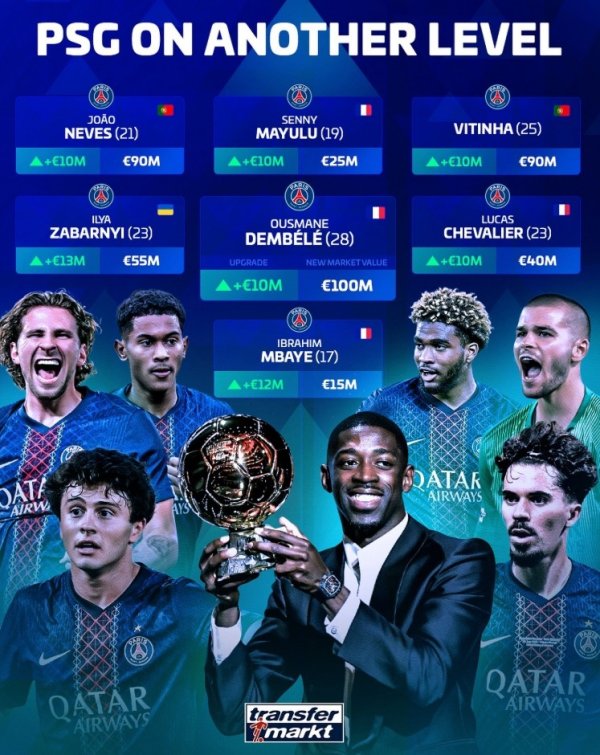 德转列巴黎多人身价上涨:登贝莱、维蒂尼亚、内维斯在列10月10日讯 德转更新了法甲球员身价,其中巴黎多人身价上涨,具体如下: 登贝莱 1亿欧(+1000万欧) 内维斯 9000万欧(+1000万欧) 维蒂尼亚 9000万欧(+1000万欧) 马尤卢 2500万欧(+1000万欧) 扎巴尔尼 5500万欧(+1300万欧) 舍瓦利耶 4000万欧(+1000万欧) 姆巴耶 1500