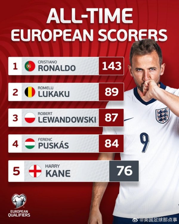 📊 欧洲国家队历史射手榜:凯恩76球进前5名,卢卡库莱万排二三1️⃣ C罗(葡萄牙) — 143 球 2️⃣ 卢卡库(比利时) — 89 球 3️⃣ 莱万(波兰) — 87 球 4️⃣ 费伦茨·普斯卡什(匈牙利) — 84 球 5️⃣ 哈里·凯恩(英格兰) — 76 球