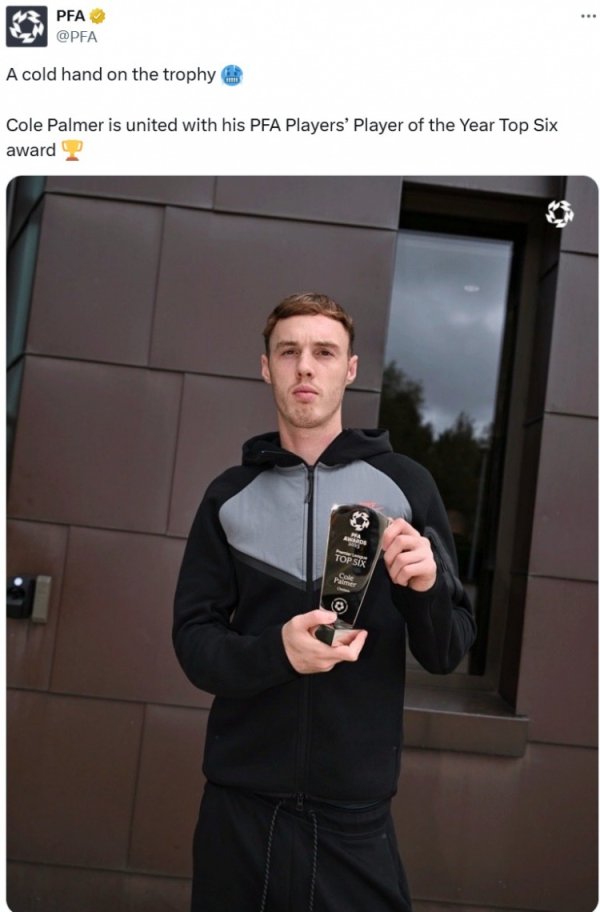 荣膺PFA年度最佳球员前6,PFA官方晒帕尔默领取奖杯照片10月7日讯 帕尔默此前荣膺PFA(英格兰职业球员工会)年度最佳球员前6名,PFA官推也晒出帕尔默领取奖杯的照片。 PFA年度最佳球员前6名由球员投票产生,入围前六名的球员分别是B费、伊萨克、麦卡利斯特、帕尔默、赖斯以及萨拉赫。