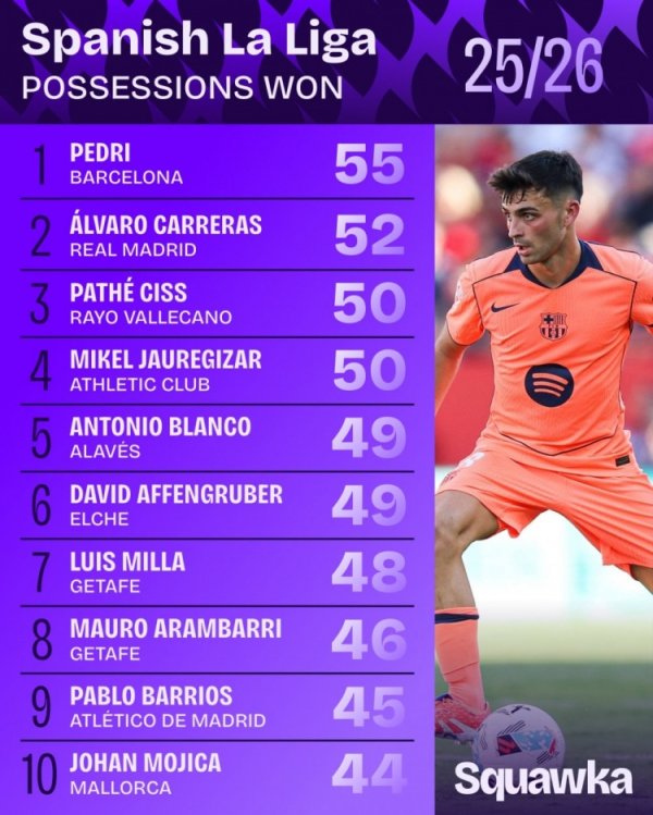 西甲夺回球权次数排行:佩德里55次居首,卡雷拉斯52次第二10月7日讯 日前,Squawka统计了本赛季西甲夺回球权次数排行,佩德里55次居首,卡雷拉斯52次第二。 1、佩德里(巴萨):55次 2、卡雷拉斯(皇马):52次 3、帕特-西斯(巴列卡诺):50次 4、豪雷吉萨尔(毕尔巴鄂):50次 5、安东尼奥-布兰科(阿拉维斯):49次 6、阿芬格鲁伯(埃尔切):49次 7、路易斯-米拉